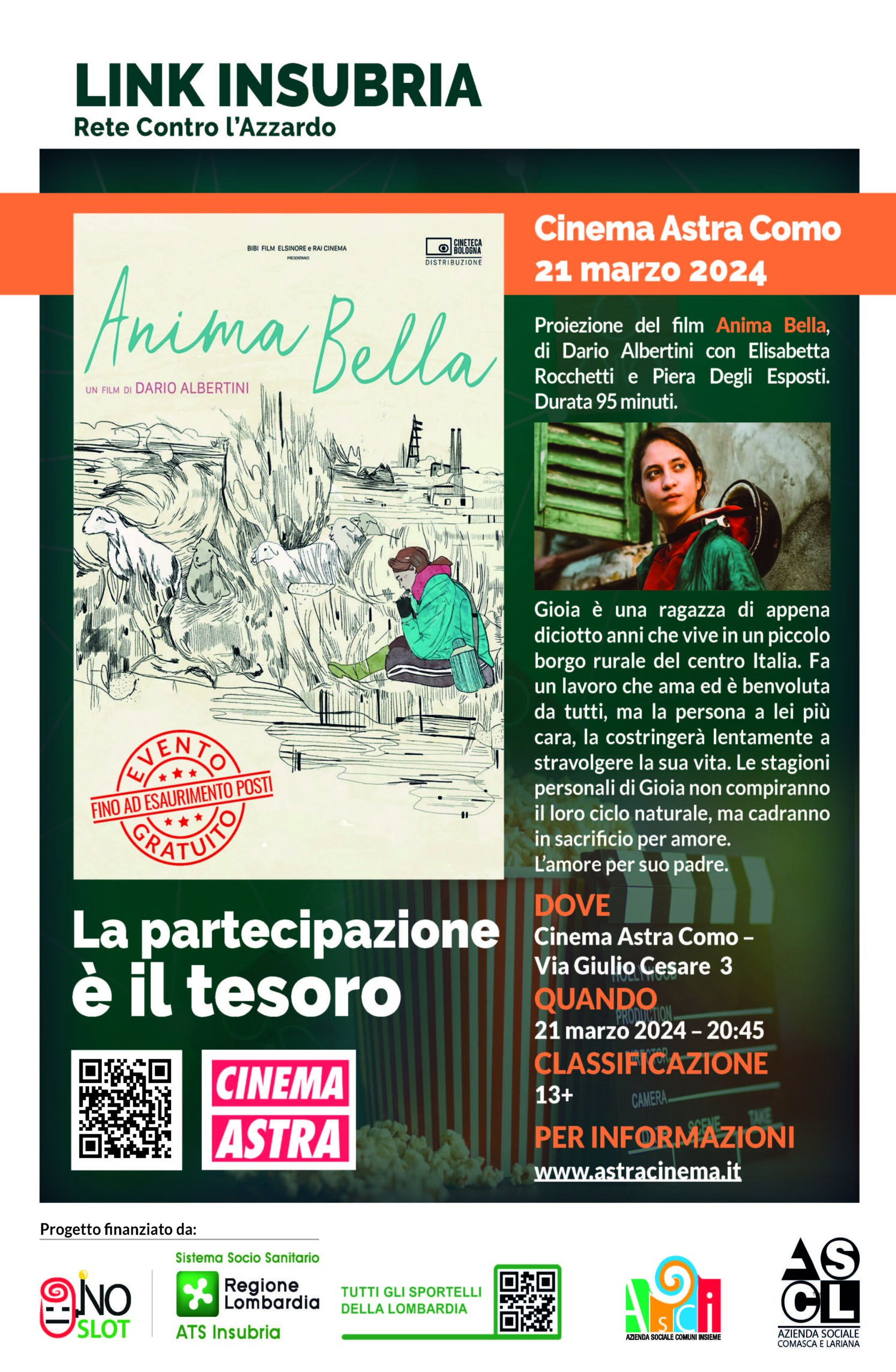 L’evento, in programma giovedì 21 marzo, alle ore 20.45, è parte del ciclo di incontri La partecipazione è il tesoro, realizzato all’interno del progetto “LINK INSUBRIA: Rete Contro l’Azzardo”, finanziato da ATS Insubria, capofila A.S.C.I. – Azienda Sociale Comuni Insieme, partner Azienda Sociale Comasca e Lariana.