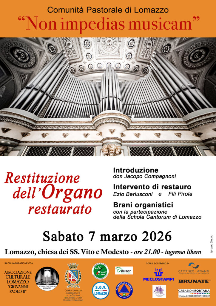Organizzato dalla Comunità Pastorale di Lomazzo, in collaborazione con la Schola Cantorum, l’Associazione Culturale Lomazzo “Giovanni Paolo II” e con il patrocinio dell’Assessorato alla Cultura del Comune di Lomazzo, l’iniziativa sarà un’occasione preziosa per conoscere più da vicino l’importante intervento che ha restituito piena voce e splendore a uno strumento di grande valore storico e liturgico per la nostra comunità.